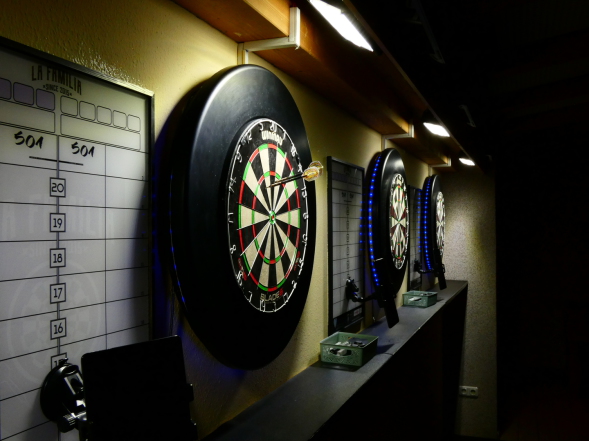 Angefangen an E-Dart Automaten, verfügen wir seit April 2016 über eine eigene, im Sportheim integrierte, Steeldartsanlage mit insgesamt vier Boards. Von der einst als "Hobbytruppe" gegründeten Sparte entwickelten wir uns weiter zu einer Liga-Mannschaft. Durch steten Zulauf haben wir nun ausreichend Darter, und stellen eine eigene Mannschaft im Ligabetrieb des BBDV.